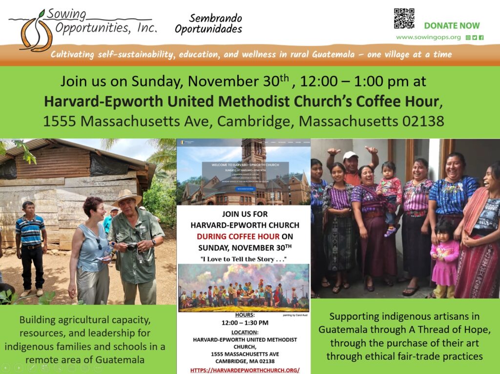 Sunday, November 30, 2025: 11:00 a.m. Introduction during Mission Moment and 12:00 noon sale of Guatemalan Fair Trade handicrafts during Coffee Hour at Harvard-Epworth United Methodist Church, 1555 Massachusetts Avenue, Cambridge, MA 02138