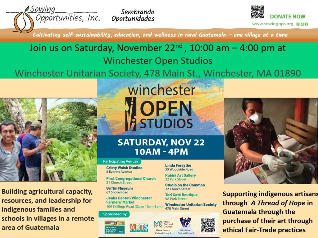 Beginning November 2021, Sowing Opportunities began to sell Guatemalan handicrafts, made by indigenous artisans, through TheGallery@57 and through direct sale, in person or via USPS. Proceeds from the sales were split between the artisans and Sowing Opportunities’ greenhouse project in Chajmaic, Guatemala. Details: https://www.sowingops.org/en/mayan-art-fundraiser/