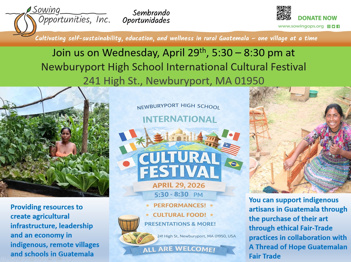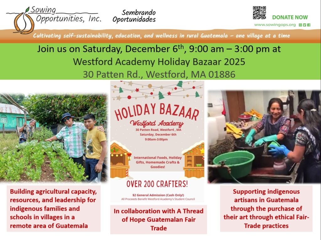 Sowing Opportunities, Inc. / Sembrando Oportunidades, which seeks to provide self-sustainability, education, and wellness in rural Guatemala, will have a table at the event to educate the public about our work.