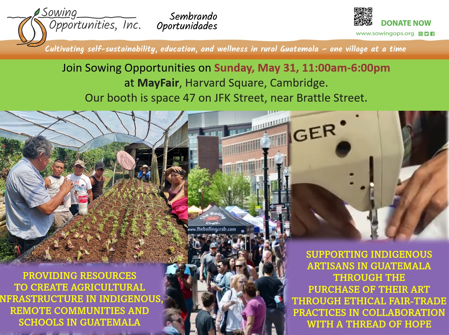 May 21, 2022, Sowing Opportunities sold plants and Guatemalan handicrafts on Saturday, 12:00-4:00 p.m. at the May-plewood Fest artist event in Maplewood Square, Malden, Massachusetts.