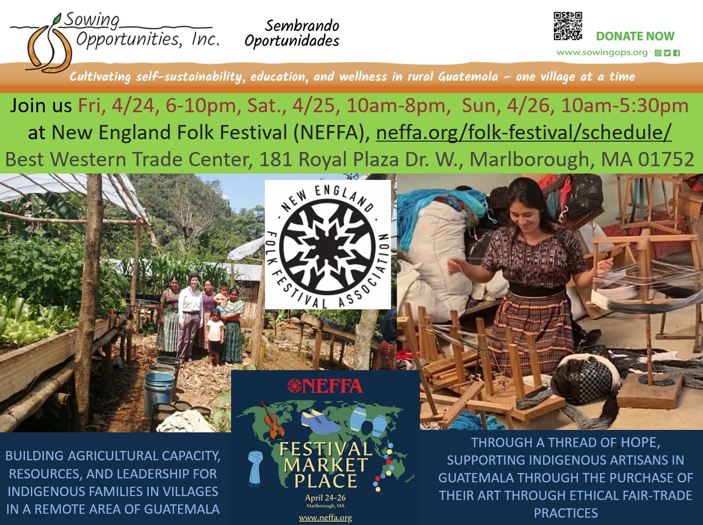 Sunday, June 22, 2025: 12:00-4:00 p.m. Malden Pride Festival, Devir Park, Malden, MA – In 2018, my wife, Ginny, and I started our nonprofit, Sowing Opportunities, to aid the indigenous remote community in Guatemala where our youngest daughter is adopted from. We are now providing sustainable agricultural solutions that result in food security for five indigenous groups in three villages in the region, including a school. We want to share our story and we sell Guatemalan fair trade handicrafts to benefit the work in the region.