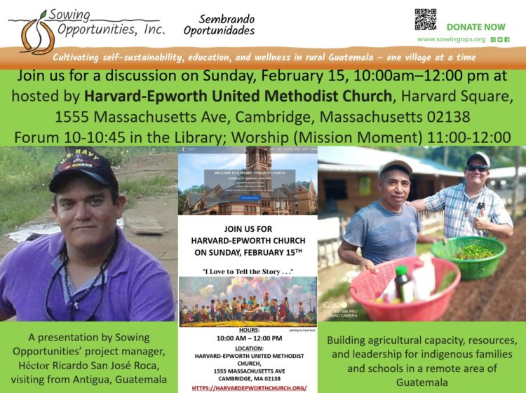 Sowing Opportunities’ project manager is coming from Guatemala mid-February. Ricardo is booked to speak at Harvard-Epworth United Methodist Church in Cambridge on Sunday morning, February 15. If you have a suggested venue for him to speak, please email info@sowingops.org . Ricardo San José Roca has been Sowing Opportunities’ project manager since 2015. He has […]